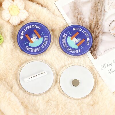 Erstellen Sie personalisierte Haarspangen, Button-Badges und Accessoires aus Acryl mit individuell bedruckten Logos, Cartoon-Designs, Anime-Charakteren oder Namen. Diese vielseitigen Anstecker verfügen über eine magnetische Rückseite zur sicheren Befestigung an verschiedenen Oberflächen.